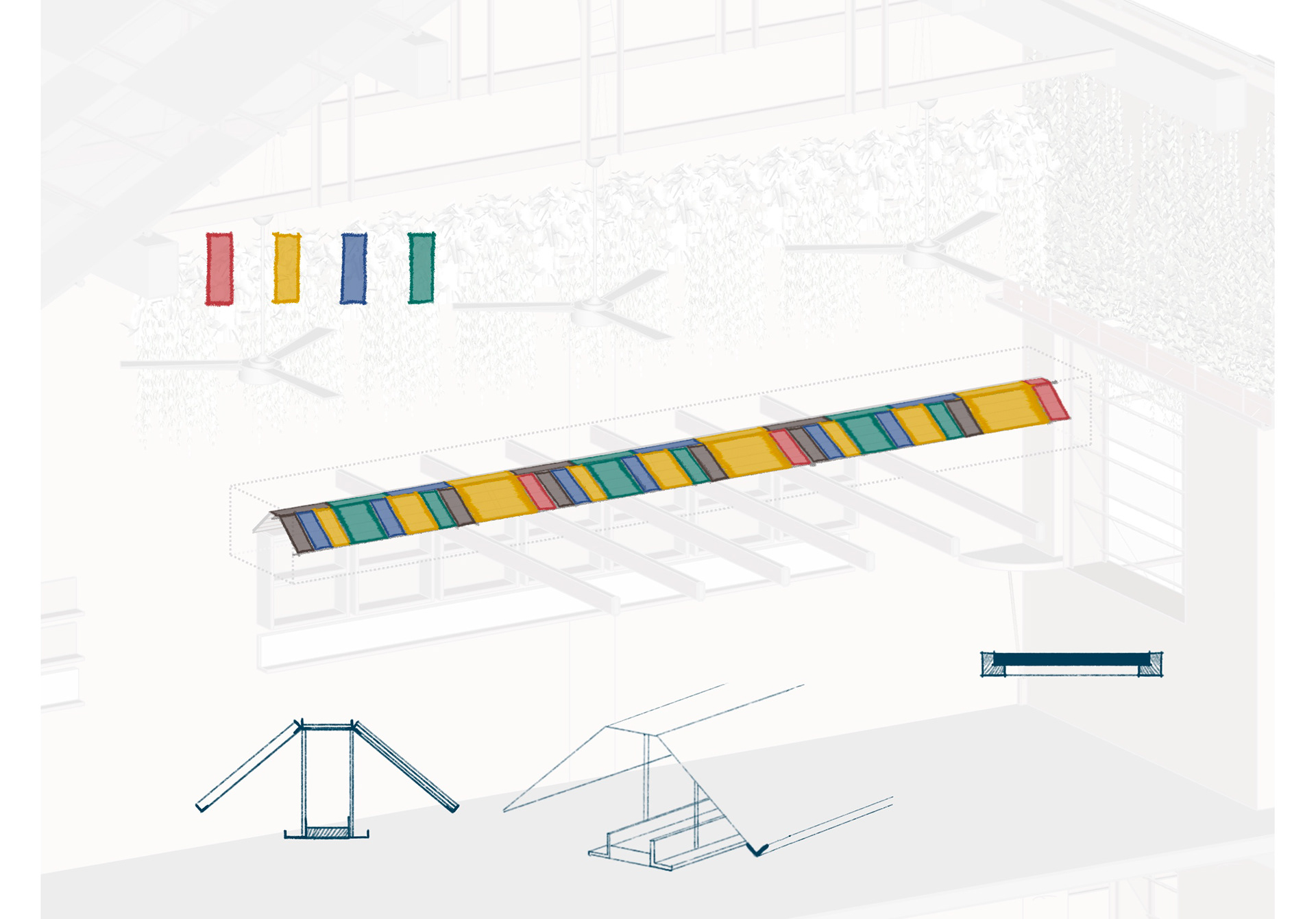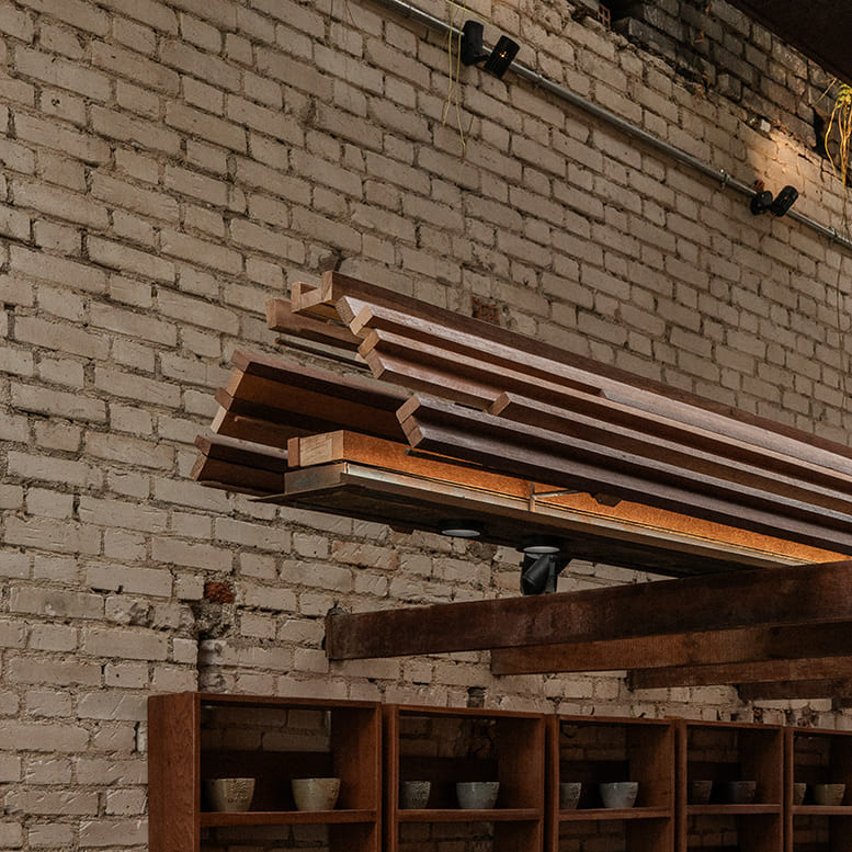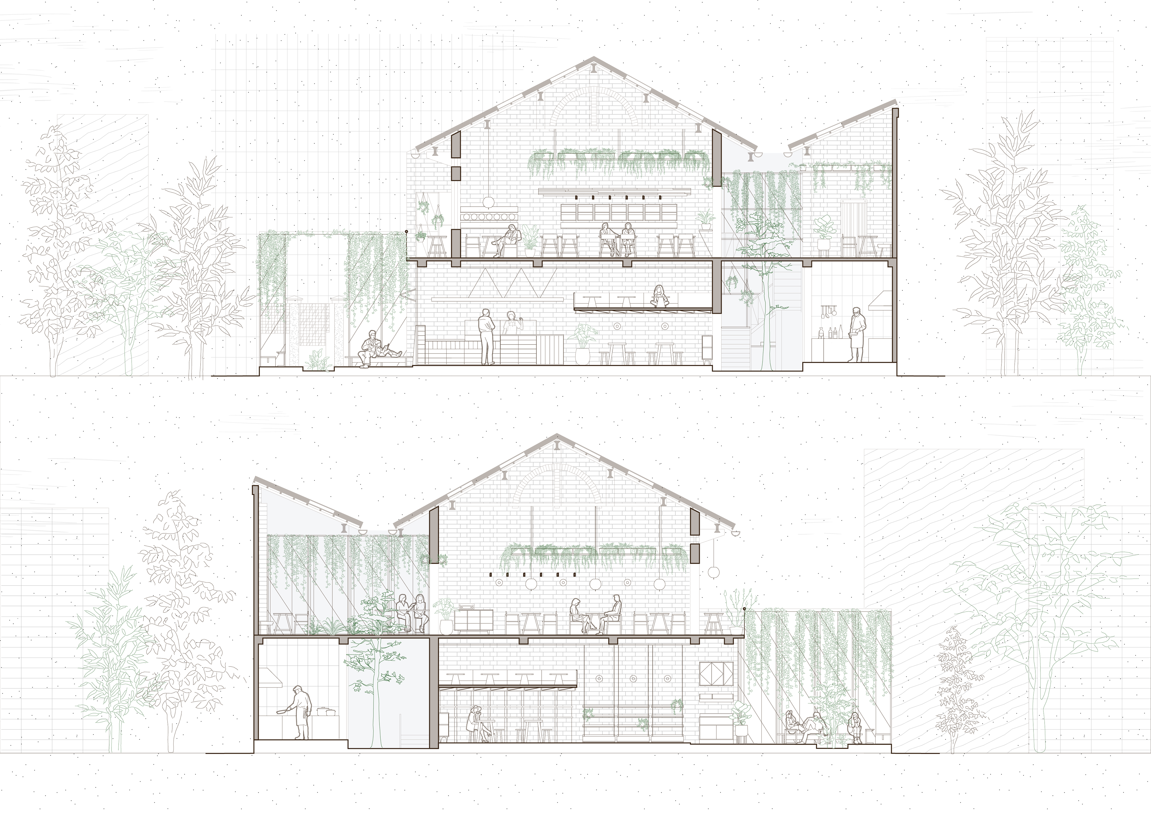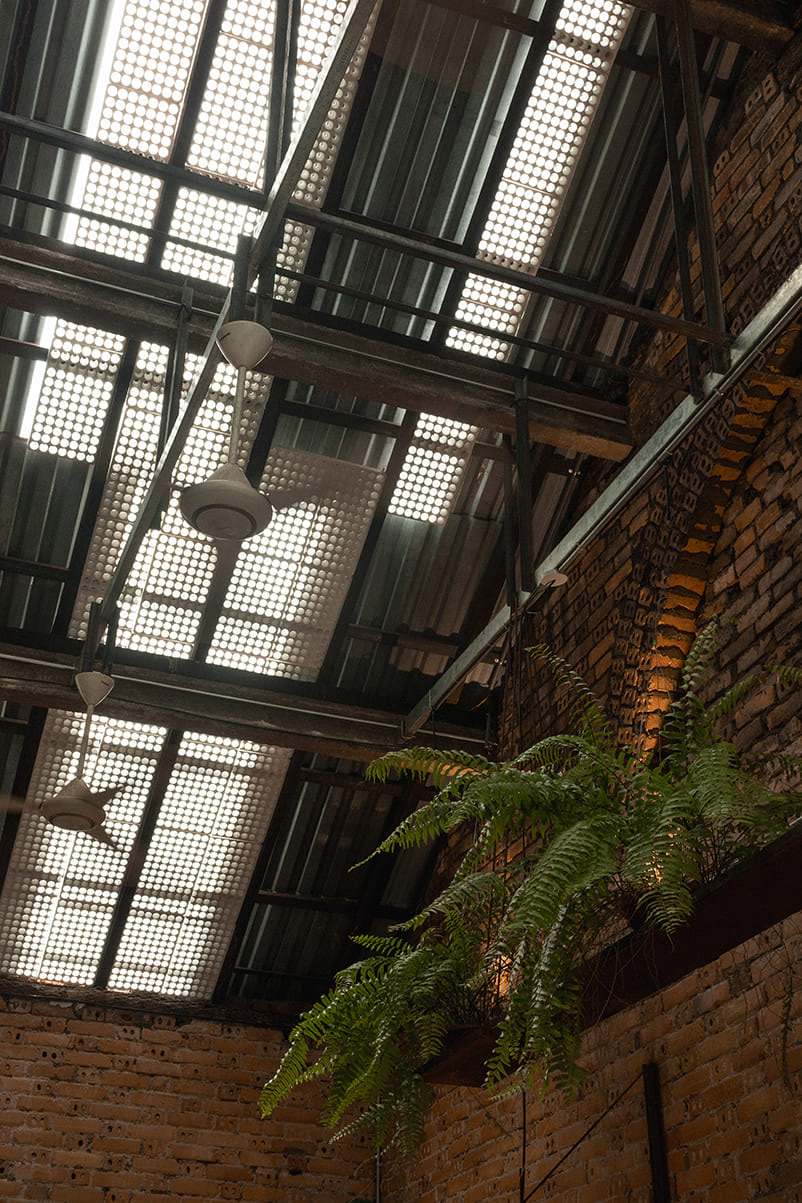 The upper level offers a gentle contrast: a tall, airy space where the original roof structure is preserved almost intact. Natural light is introduced through lightweight materials such as mesh, planted foam panels, and carefully calibrated lighting solutions. Overscaled lighting fixtures are positioned in dialogue with the existing wooden structure, creating a space that is sufficiently enclosed for dining while simultaneously defining an interior rhythm that remains connected to the overall architectural composition.