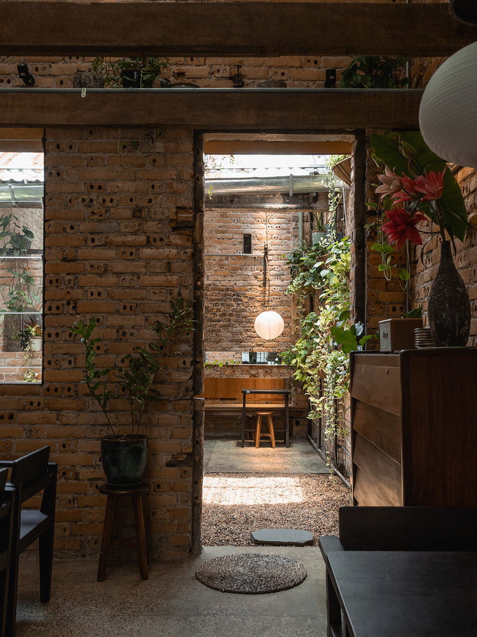 The ground floor retains the wooden beam system—a characteristic architectural element of traditional Chinese houses—and is used as a low-ceiling dining space. This spatial organization fosters a sense of intimacy, evoking traditional modes of living: low communal tables, a close-knit atmosphere, and shared meals.