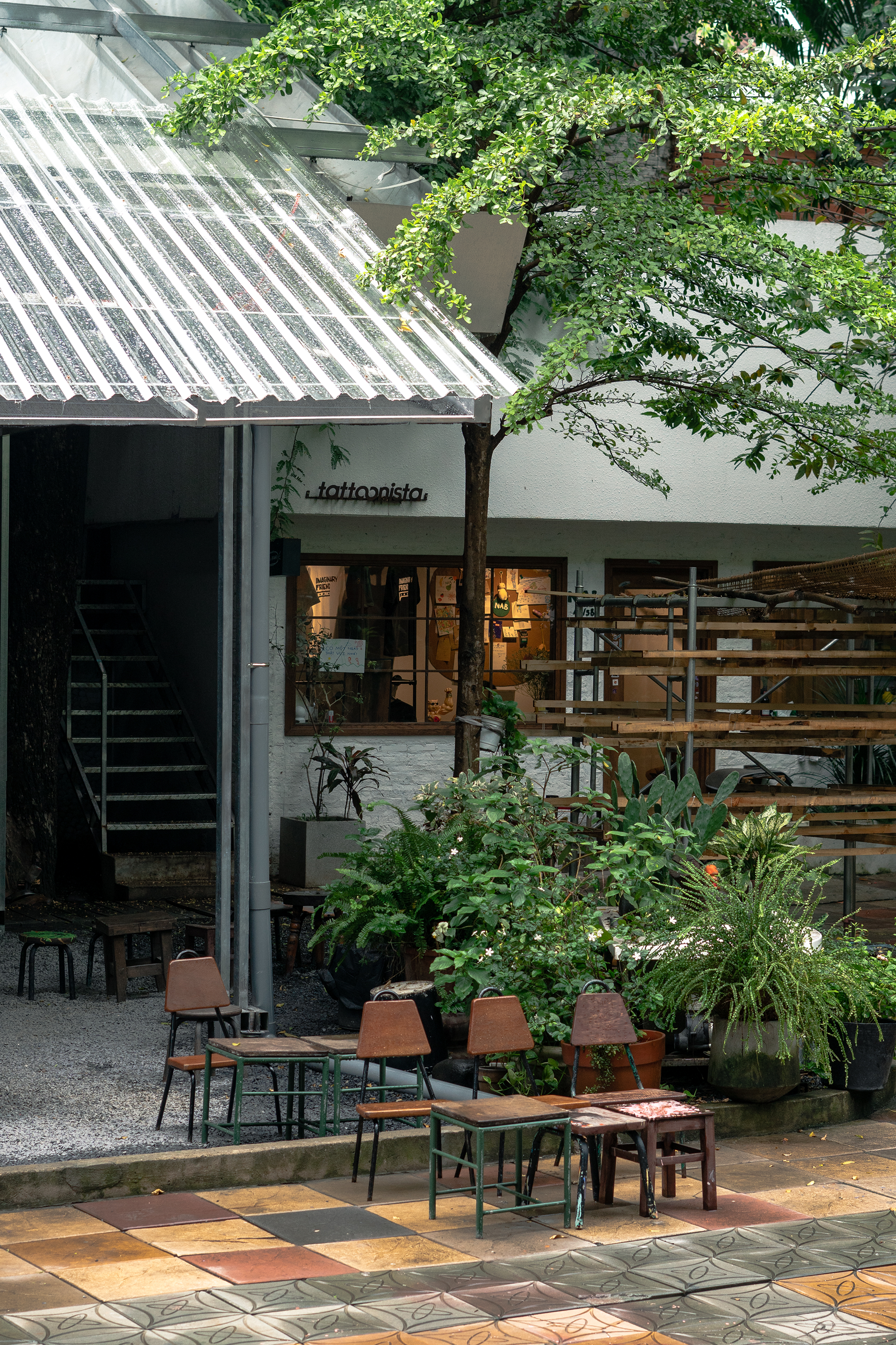 Trong bối cảnh mở như vậy, lối vào đóng vai trò như một đường hầm, hướng dẫn khách ghé thăm đi qua các căn studio lấp ló dưới tán cây.
